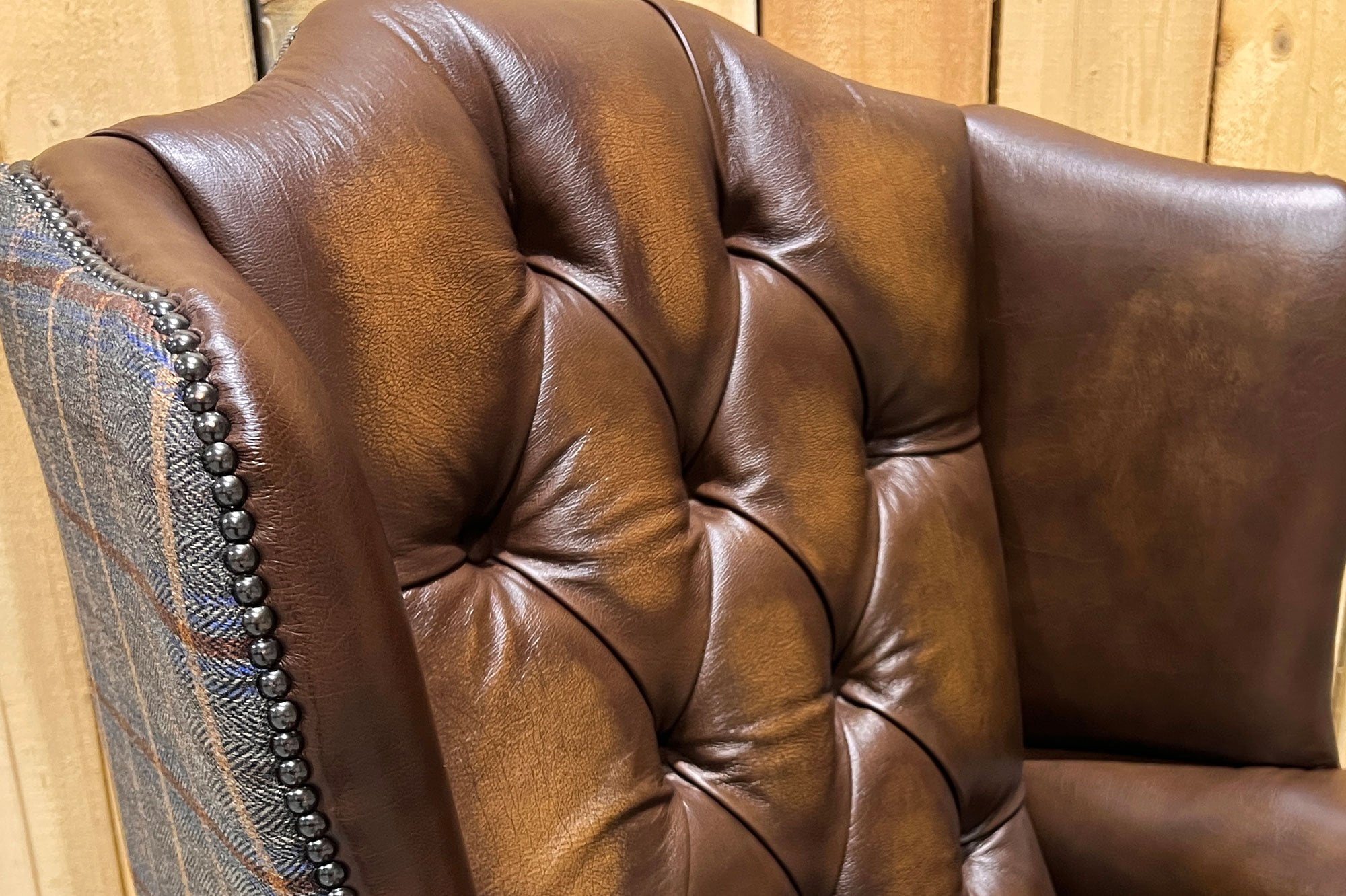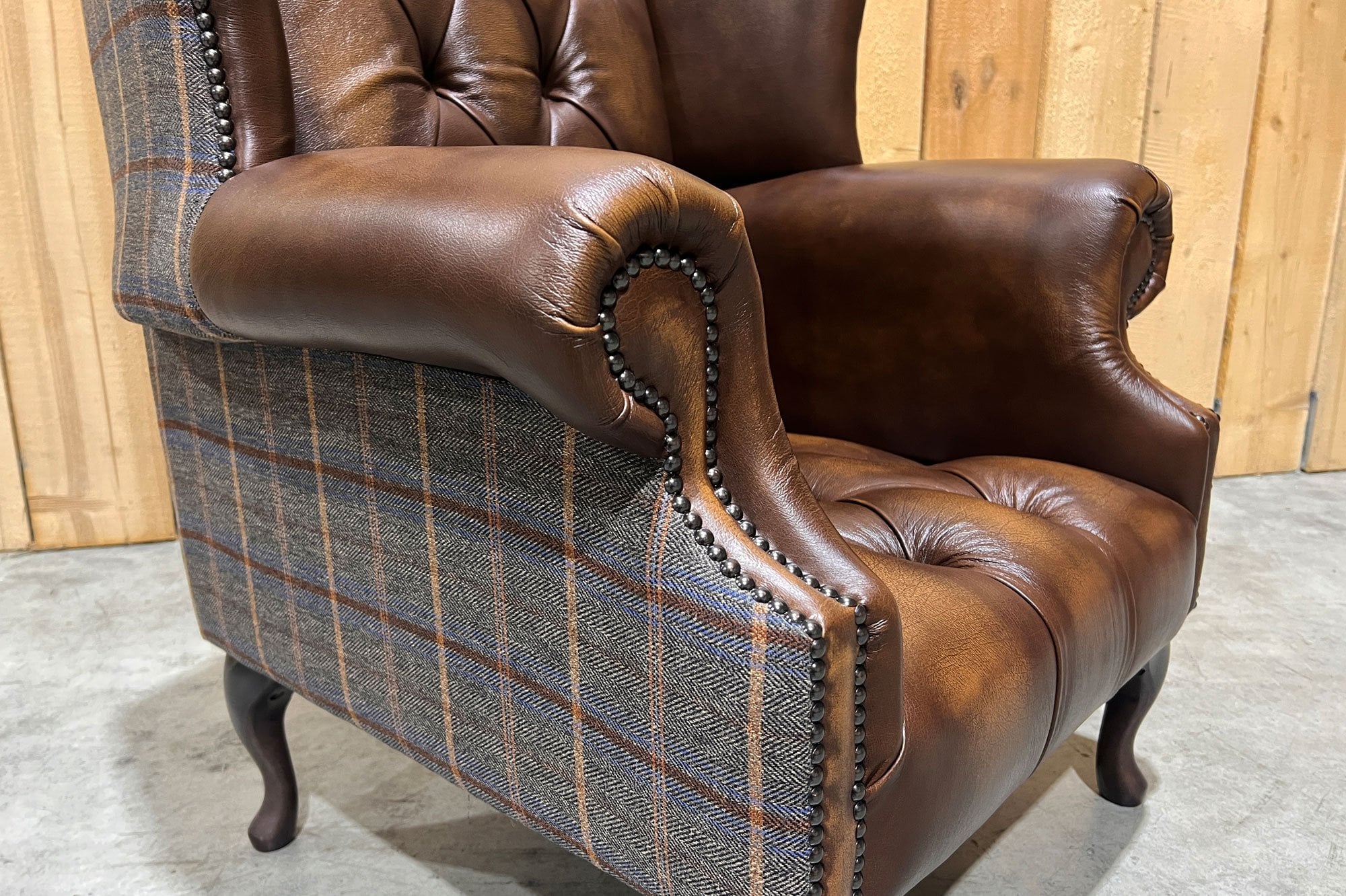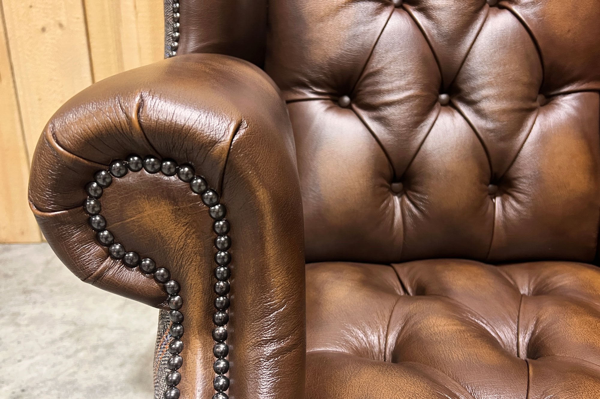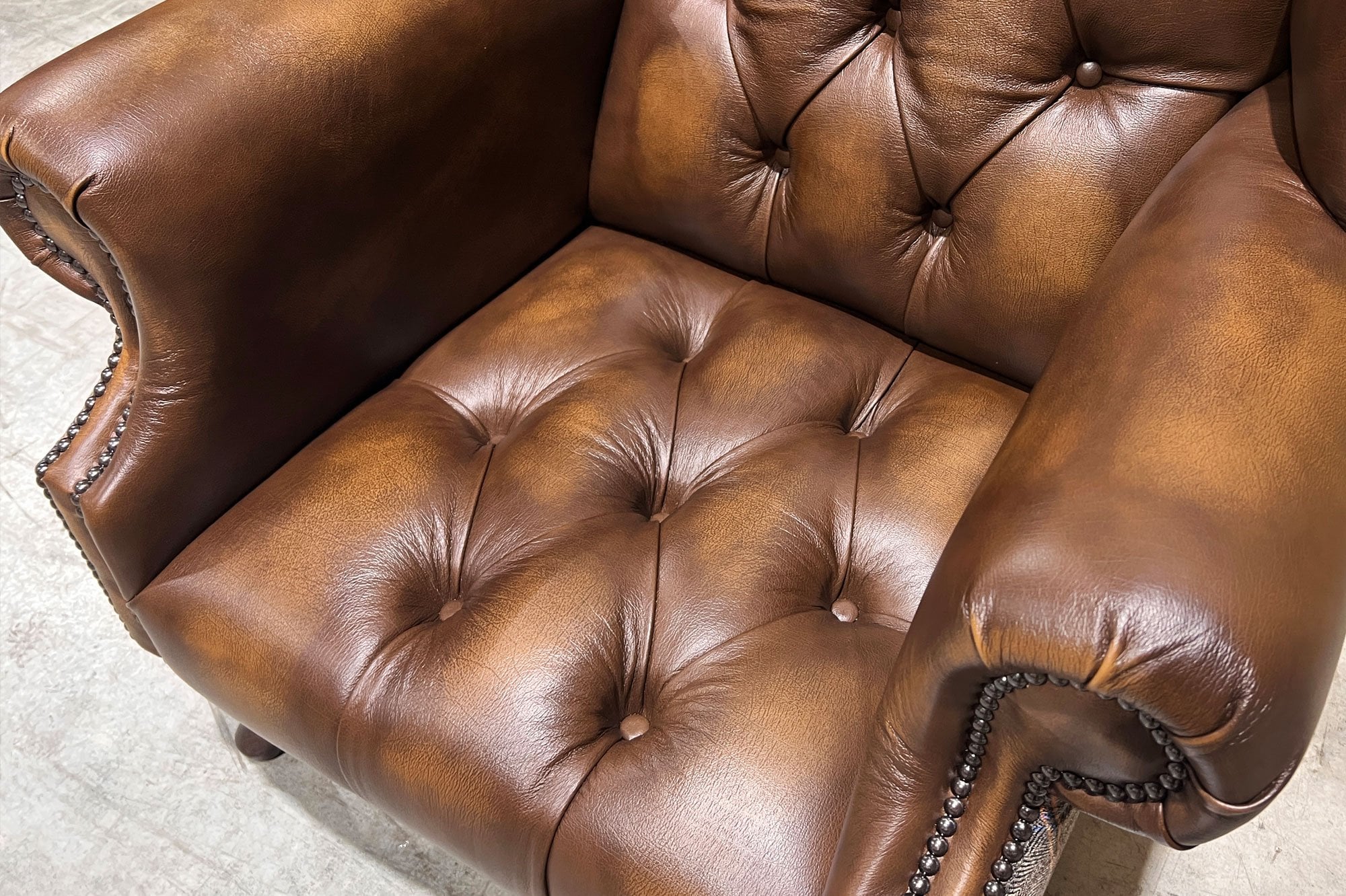 The Orkney Chesterfield Wing Chair is a distinguished embodiment of classic British upholstery, meticulously handcrafted to offer both timeless elegance and enduring comfort. Designed with a commanding wingback silhouette and refined proportions, this armchair brings an elevated presence to any interior, whether as a focal statement piece or a cherished reading chair.