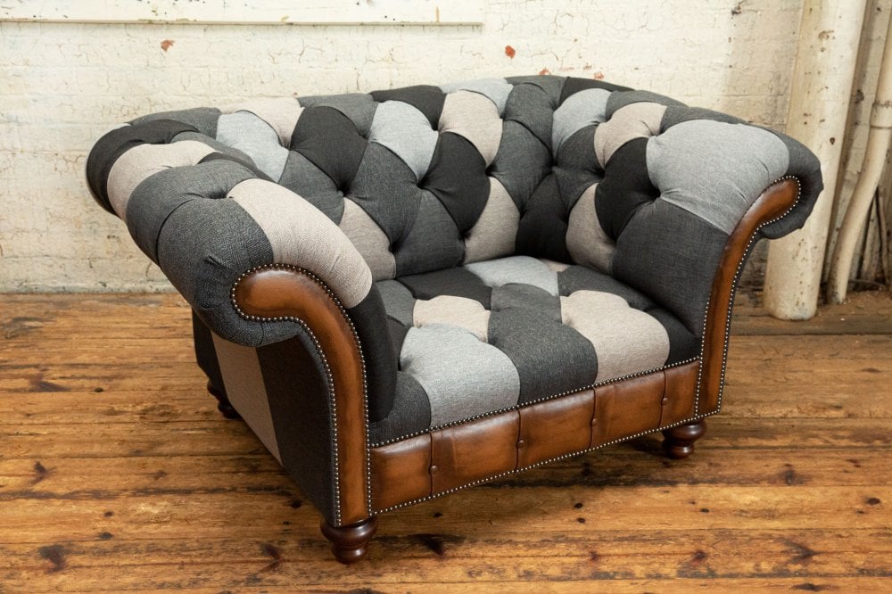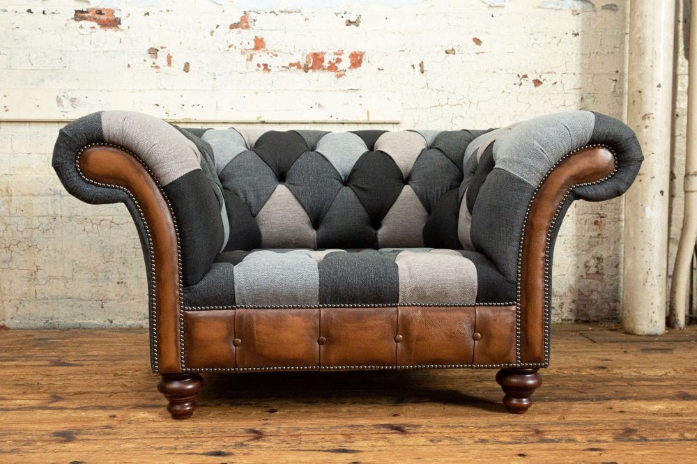 The Camden Patchwork Chesterfield Suite is a considered adaptation of our Brighton Patchwork design, retaining the same sophisticated palette of layered greys while introducing hand-finished antique leather detailing for added depth, warmth and character.