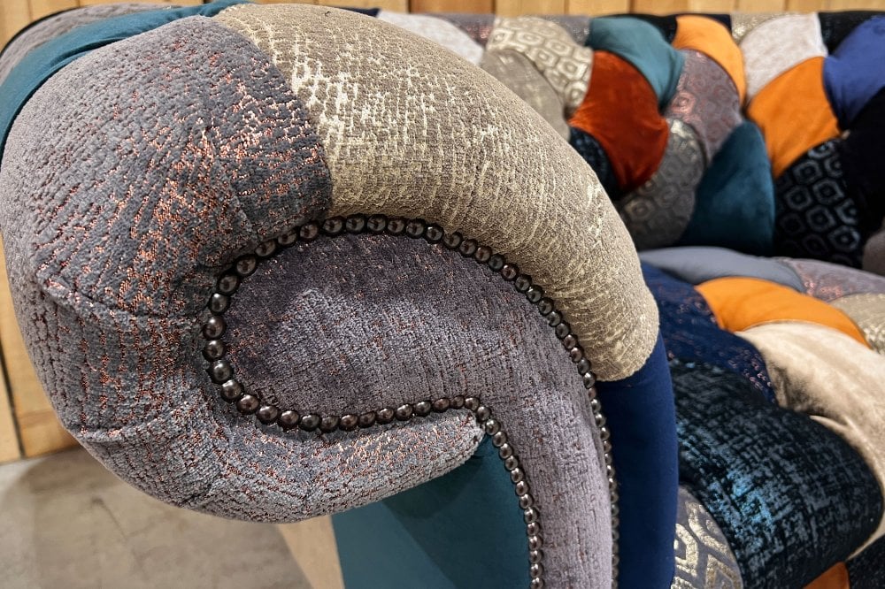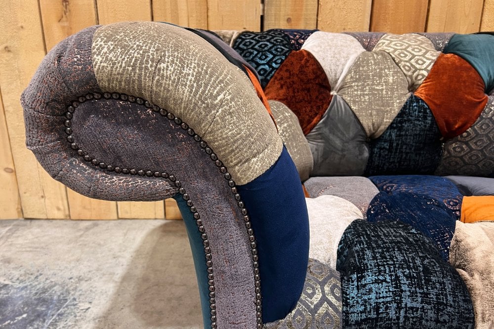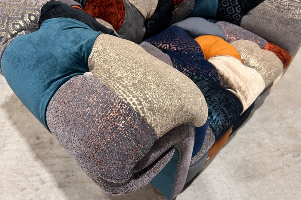 The Weymouth Patchwork Chesterfield Suite is inspired by the dramatic beauty of the Jurassic Coast and the iconic seaside town of Weymouth, renowned for its sweeping shoreline and glowing orange sunsets. This expressive collection translates coastal atmosphere into a bold yet refined patchwork design, rich in colour, texture and visual depth.