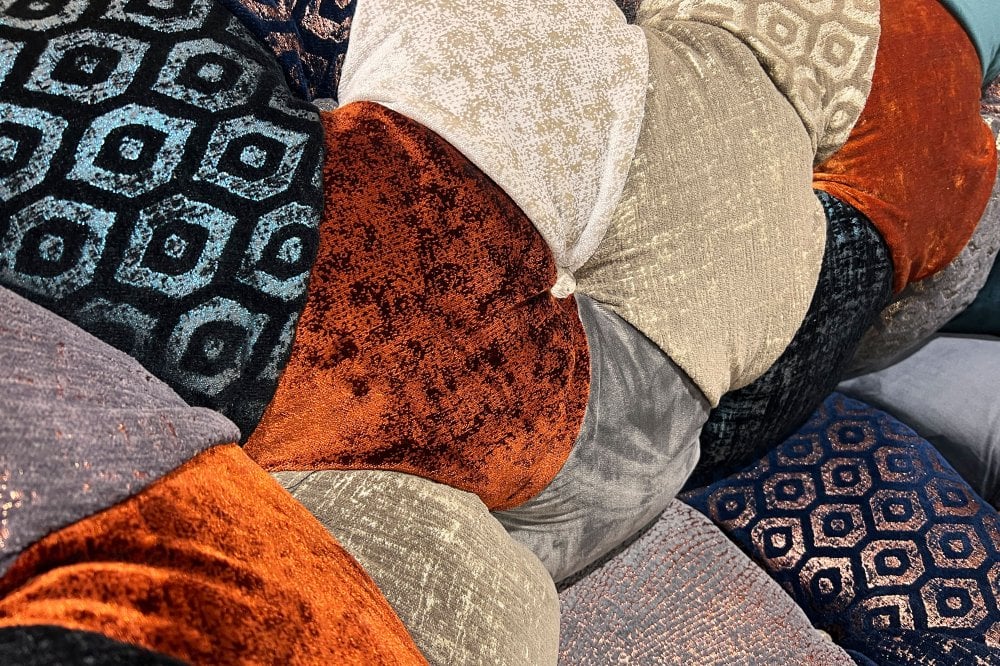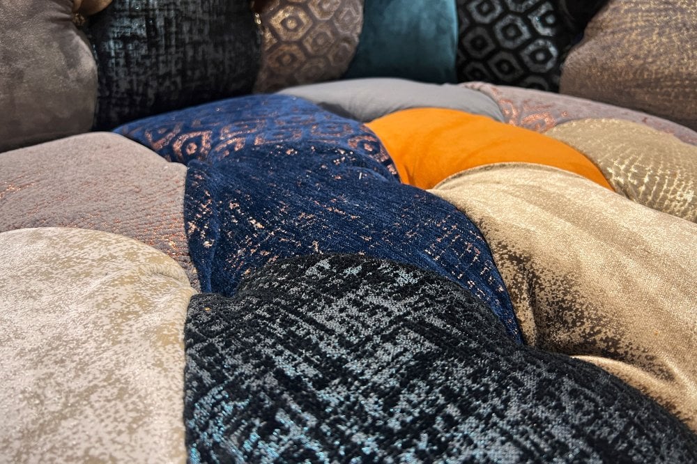 A striking palette of copper orange, deep navy and soft greys is layered across the suite using contrasting velvet textures. Subtle copper and champagne metallic undertones catch the light, enhancing the patchwork composition and creating an almost three-dimensional effect that brings warmth, movement and sophistication to the upholstery.