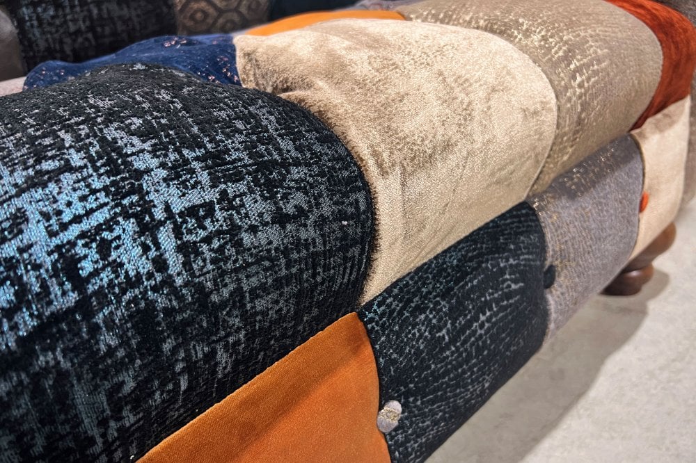 Upholstered in a curated selection of our exclusive fabrics, the Weymouth Patchwork Suite moves effortlessly between plush copper-orange and navy velvets, balanced with bold grey patterned panels. The result is a confident, eclectic aesthetic that delivers a modern finish while remaining unmistakably luxurious.