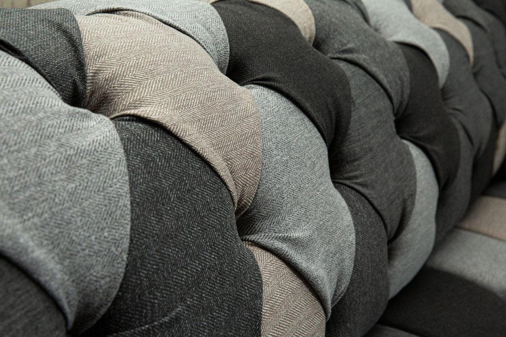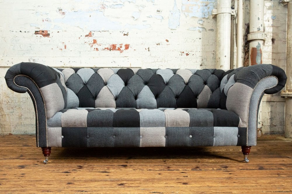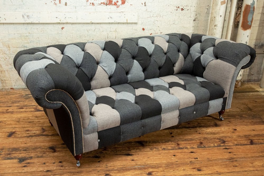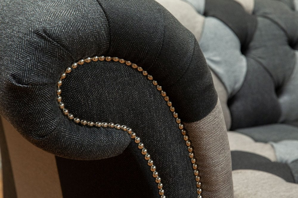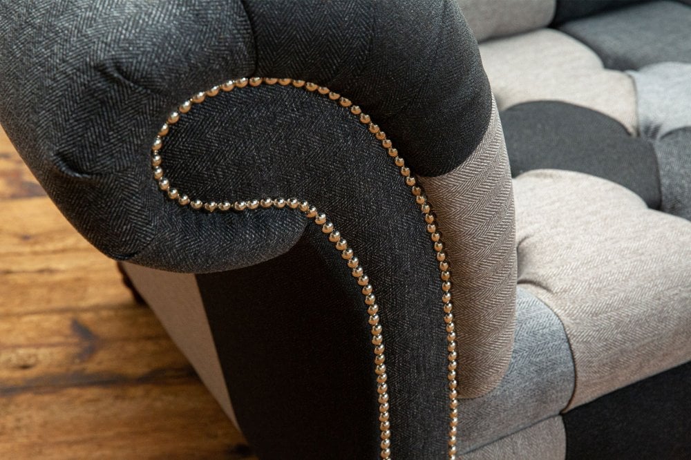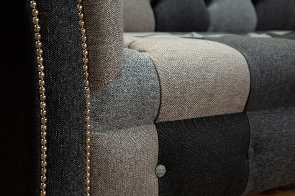 Introducing the Brighton Patchwork Chesterfield Suite, an artfully curated collection designed to bring cohesion, texture and understated elegance to your living space. This distinctive suite combines layered fabrics and subtle pattern variation in a palette of warm and cool grey tones, creating a refined yet relaxed aesthetic with contemporary appeal.