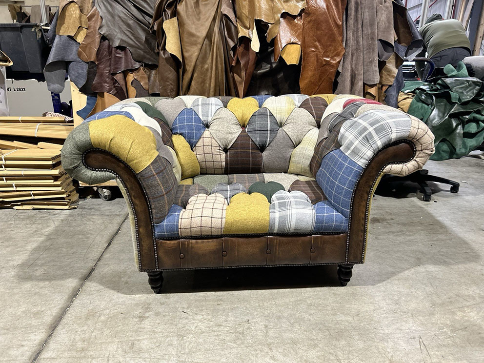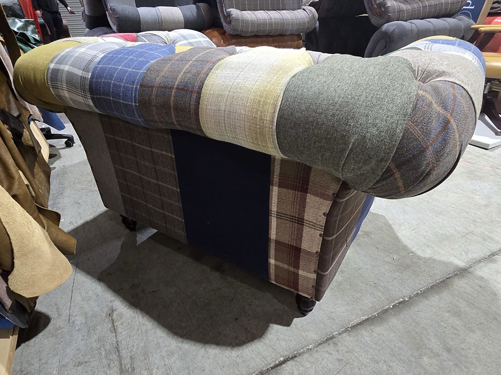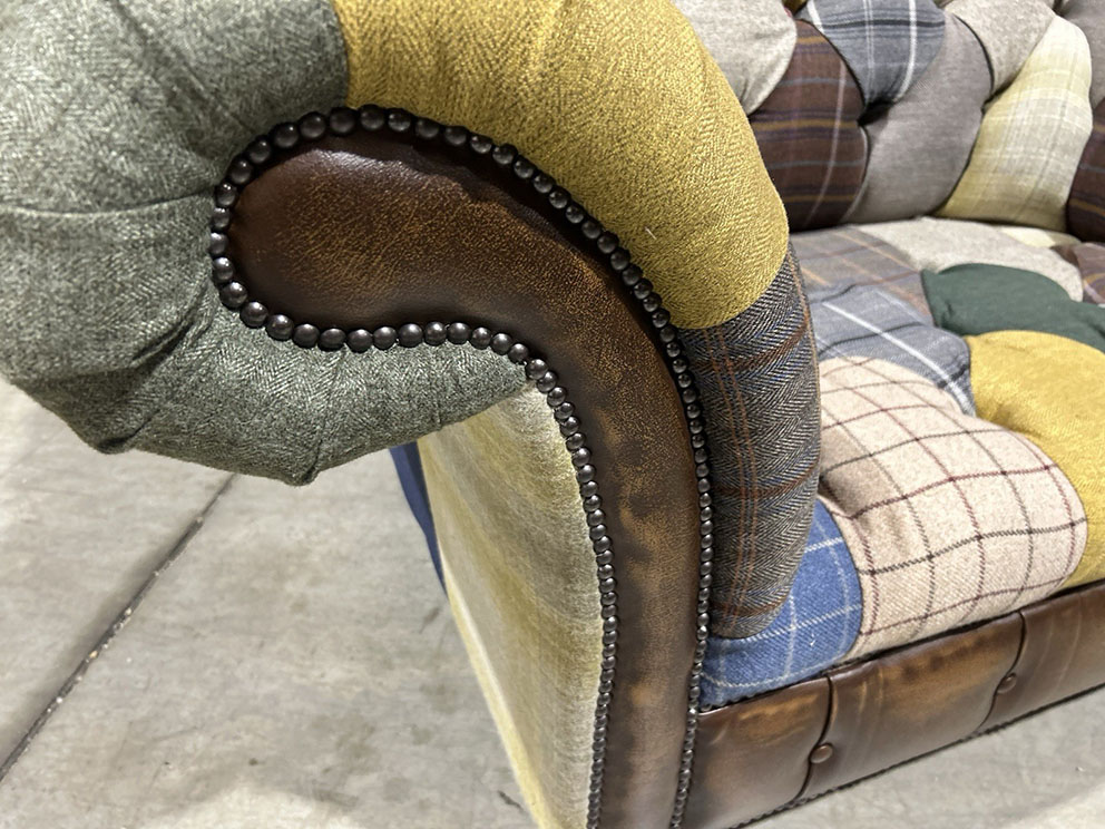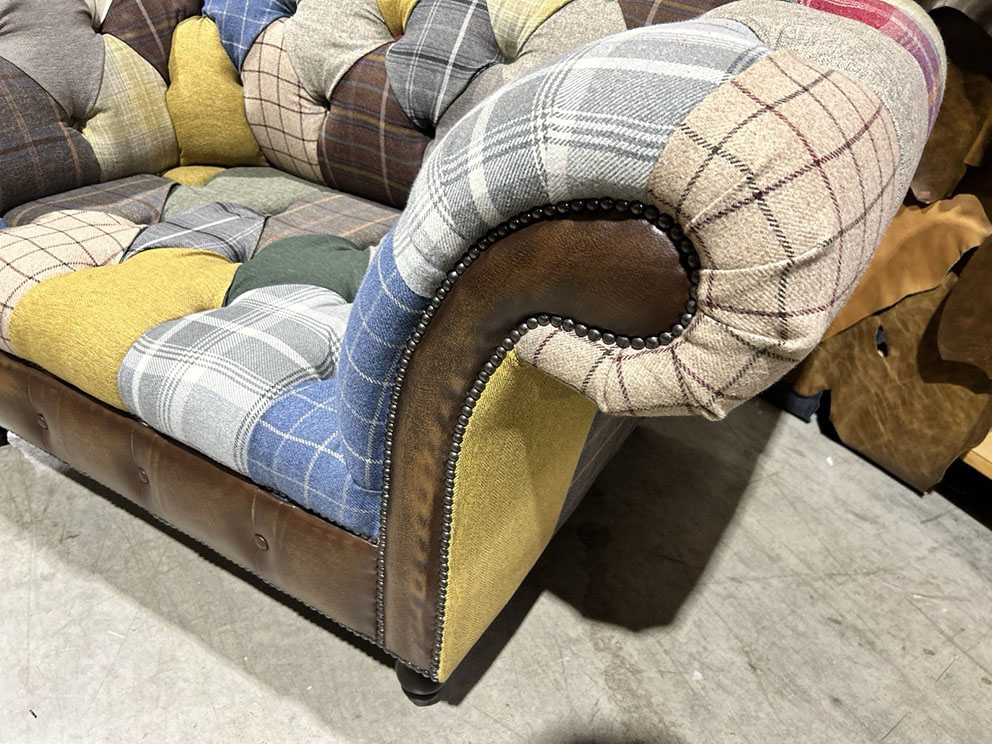 1.5 Seater Multicoloured Chesterfield Sofa with Leather facings and border.