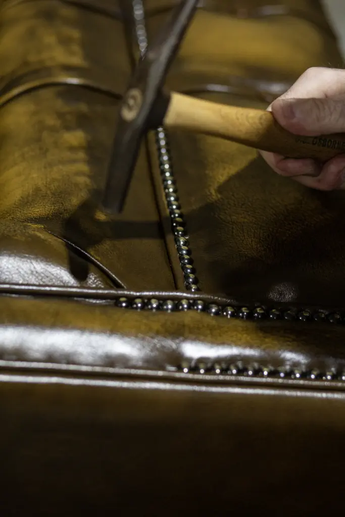 Our finishing team oversees the final assembly, ensuring that every element—from border detailing to stud colour and placement—aligns perfectly with your chosen specification. Decorative studs are never applied using pre-made strips. Instead, each stud is individually positioned and hand-set directly into the frame, a slower but far superior method that ensures strength, accuracy, and lasting definition.